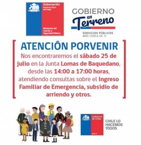 La Gobernación de Tierra del Fuego, informa que el día sábado 25 de julio en la sede de la Junta de Vecinos Lomas de Baquedano, se realizará un Gobierno en Terreno, en la cual personal profesional atenderá consultas en relación al nuevo ingreso de emergencia, subsidio de arriendo, entre otros.