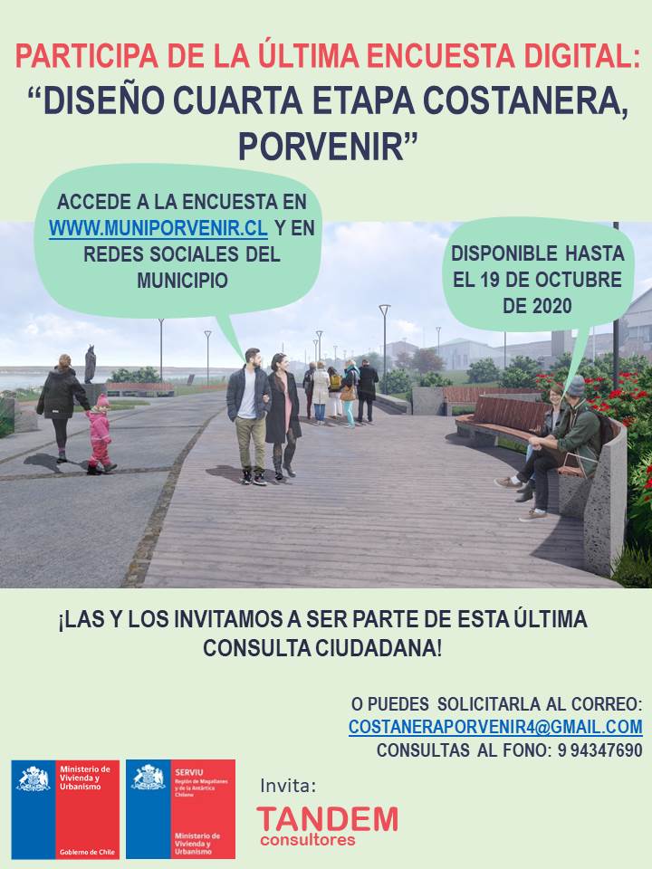 En la última etapa del Proyecto: Diseño Cuarta Etapa Costanera de Porvenir, invitamos a la comunidad a participar de la Encuesta Digital en el link: https://docs.google.com/forms/d/e/1FAIpQLSf9cNS0SK1KXupVCNviOeaxt2uYQWm8W89fkA6_77EWNGUkuQ/viewform?usp=sf_link actividad que se desarrollará desde el lunes 05 al lunes 19 de octubre de 2020, donde podrán conocer los resultados de los procesos de […]